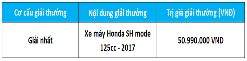1. Giải thưởng: 100% quà tặng ngay khi mua sản phẩm & quay thưởng “3 ngày 1 xe SH” cho các khách hàng may măn